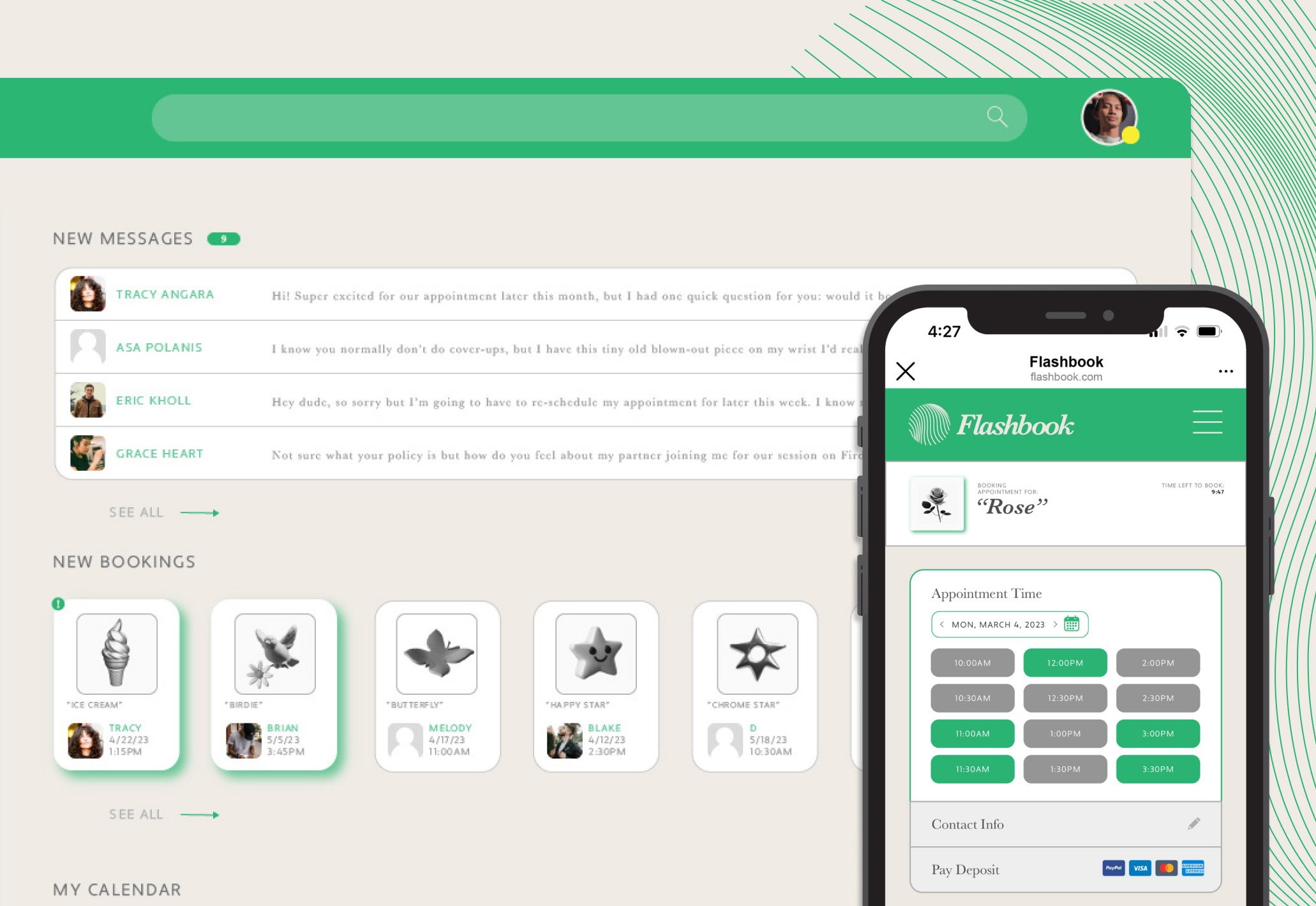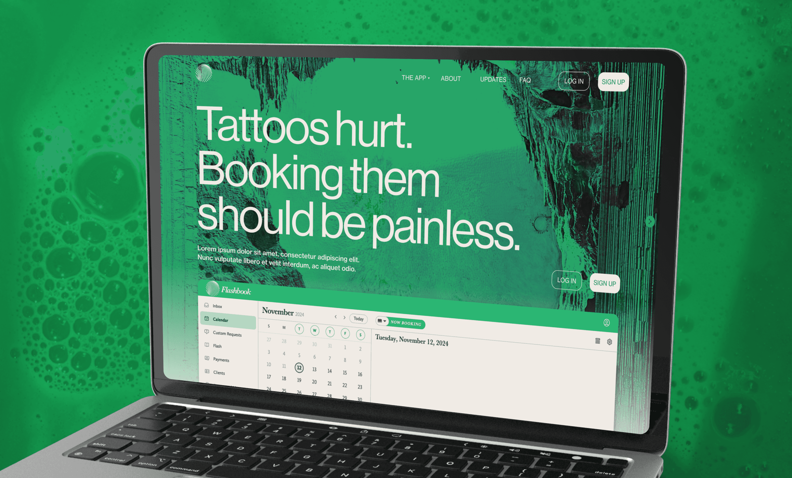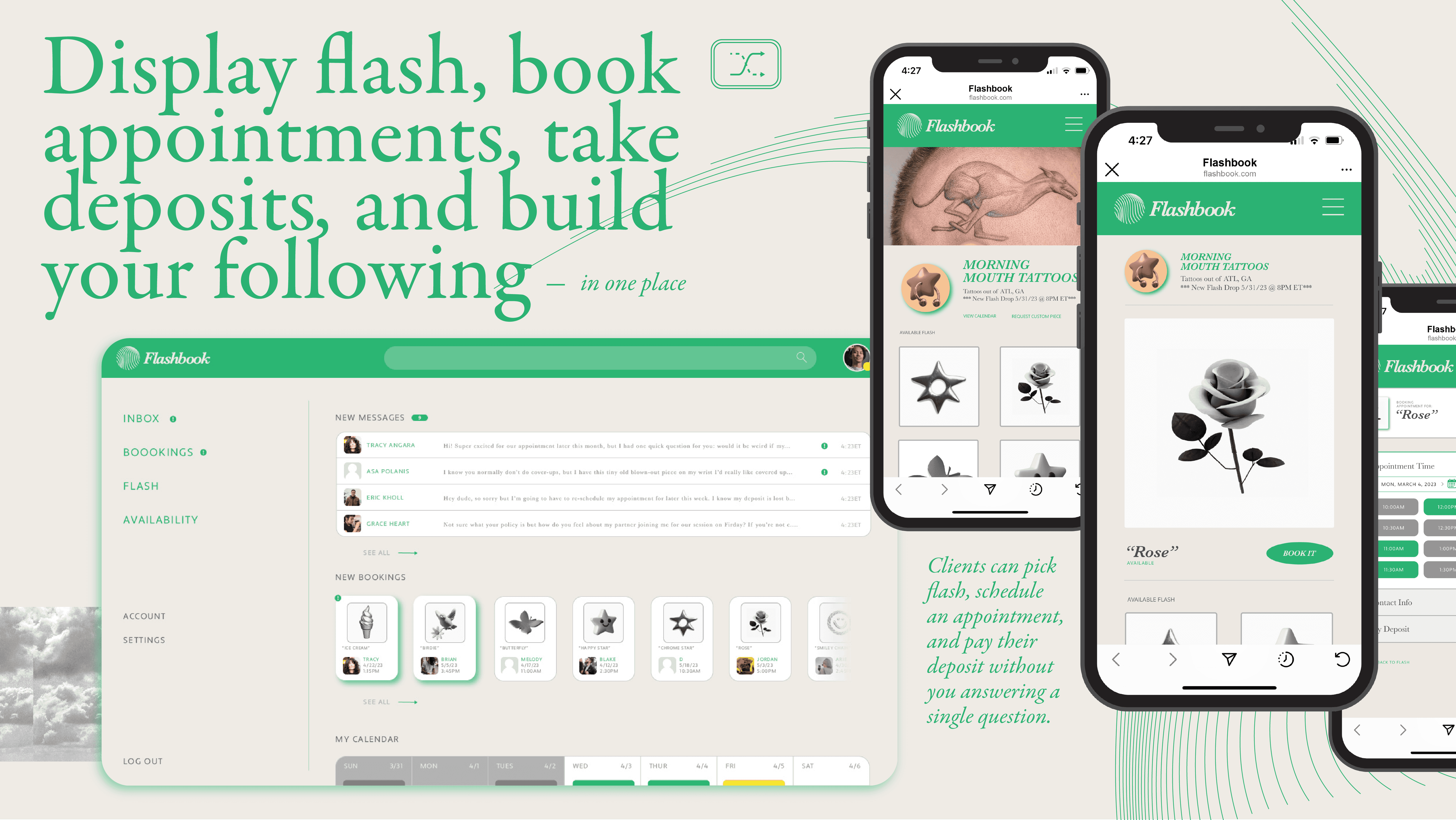 Flashbook is a tattoo-booking app that unifies the disparate processes of an artist's management systems and demystifies the appointment booking process for clients. The app sought to disrupt the social-media locked independent tattoo space by decoupling an artist's revenue from the whims of Instagram's algorithm.