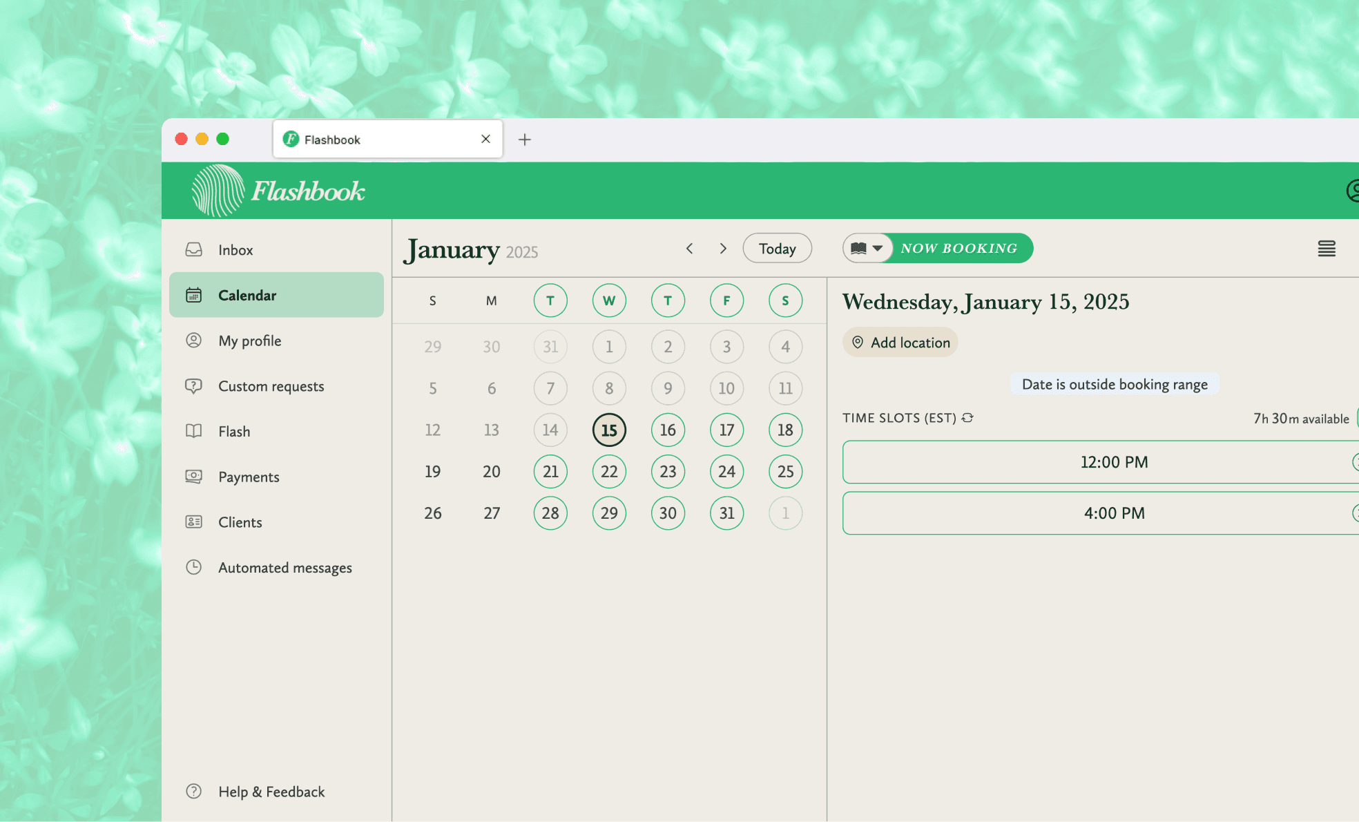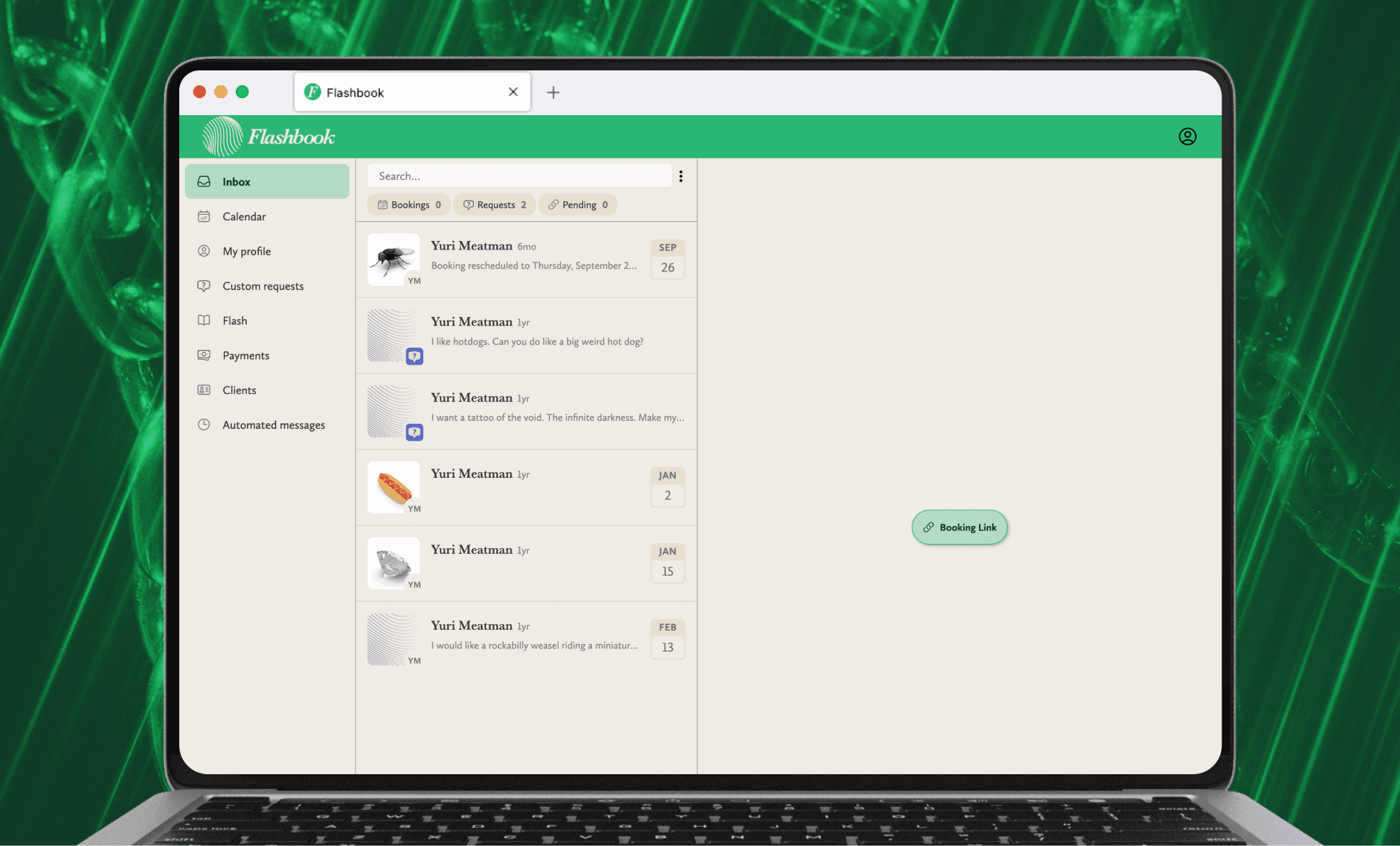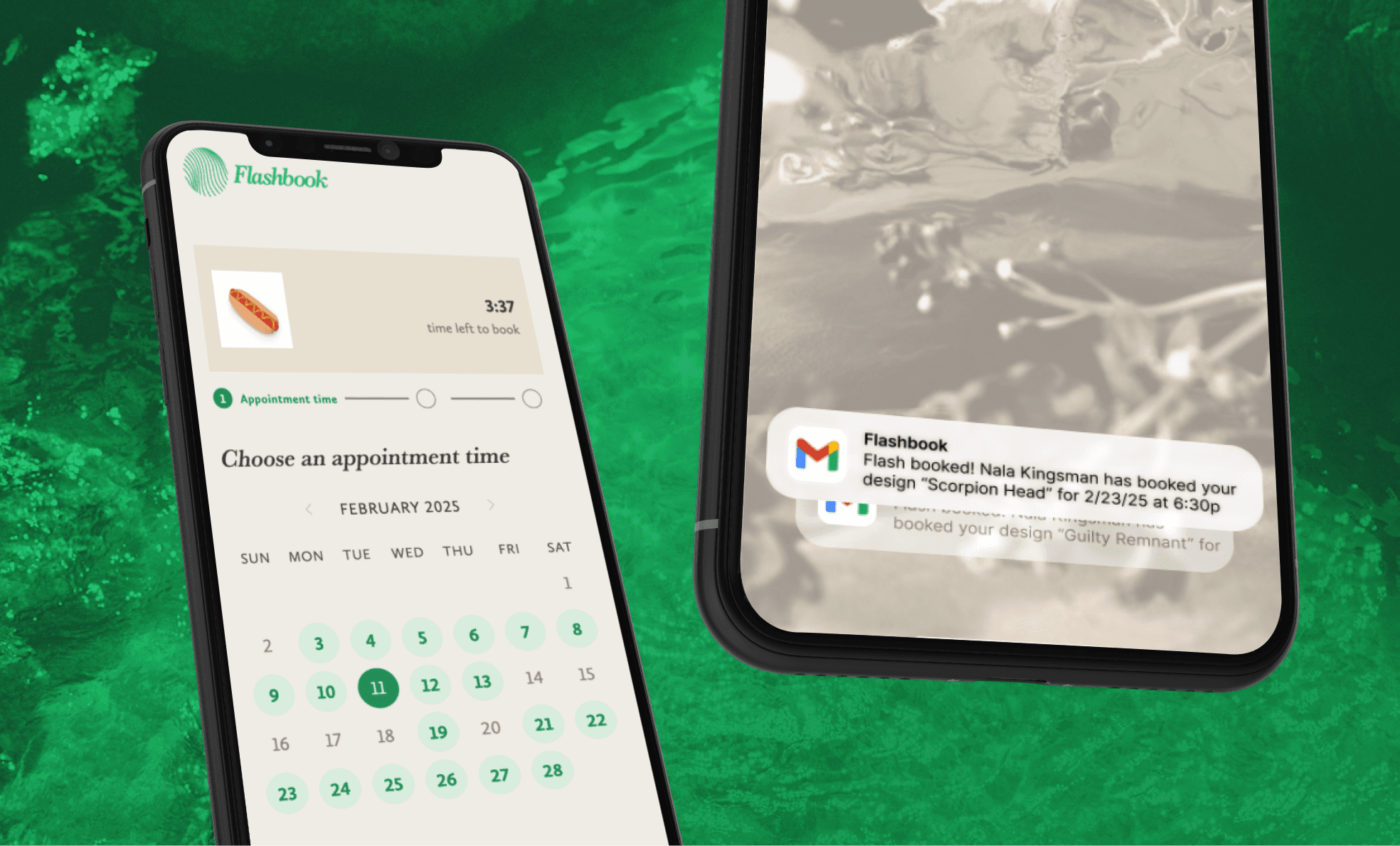 Flashbook is a tattoo-booking app that unifies the disparate processes of an artist's management systems and demystifies the appointment booking process for clients. The app sought to disrupt the social-media locked independent tattoo space by decoupling an artist's revenue from the whims of Instagram's algorithm.