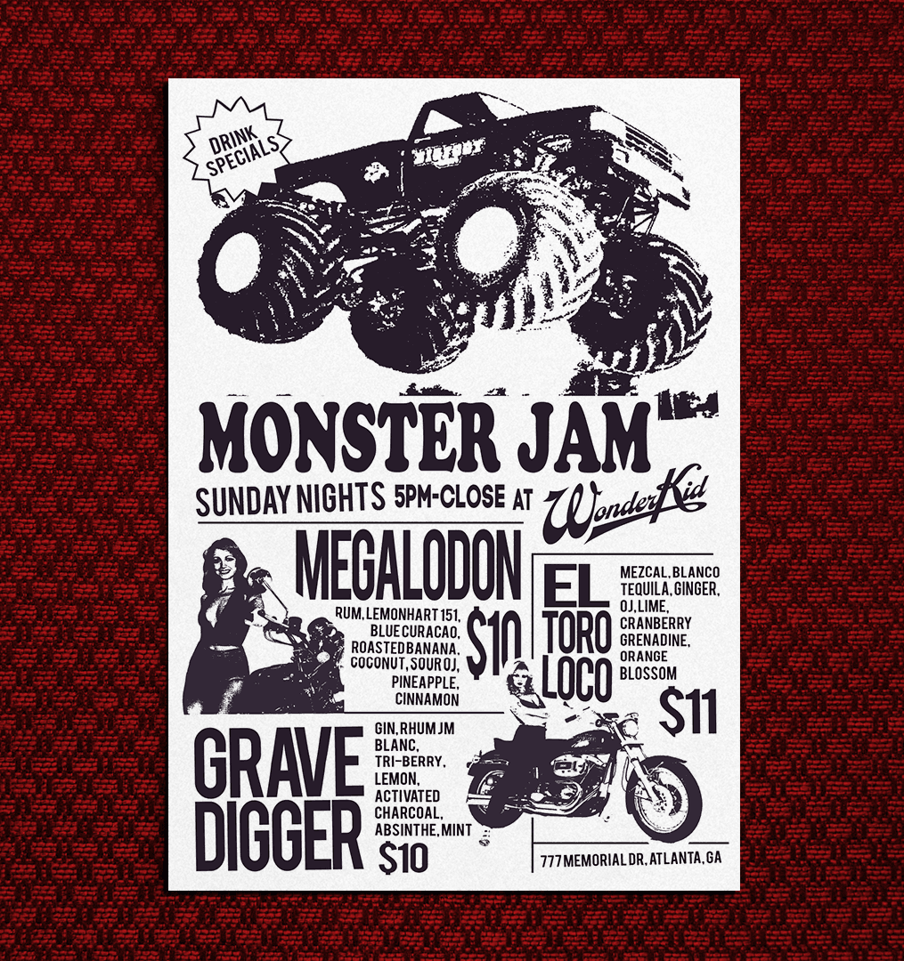 Wonderkid is a wild ride back to the late-70s era of good times and great food. The restaurant/bar needed a brand identity system that transported patrons to an era filled with fast cars and good times. The challenge came with how build an identity system robust enough to translate such a specific era of Americana into the modern age while making it all feel effortless and lived-in.